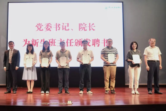 91网站 党委梅成达书记和院长张亮教授为新生班主任颁发聘书。